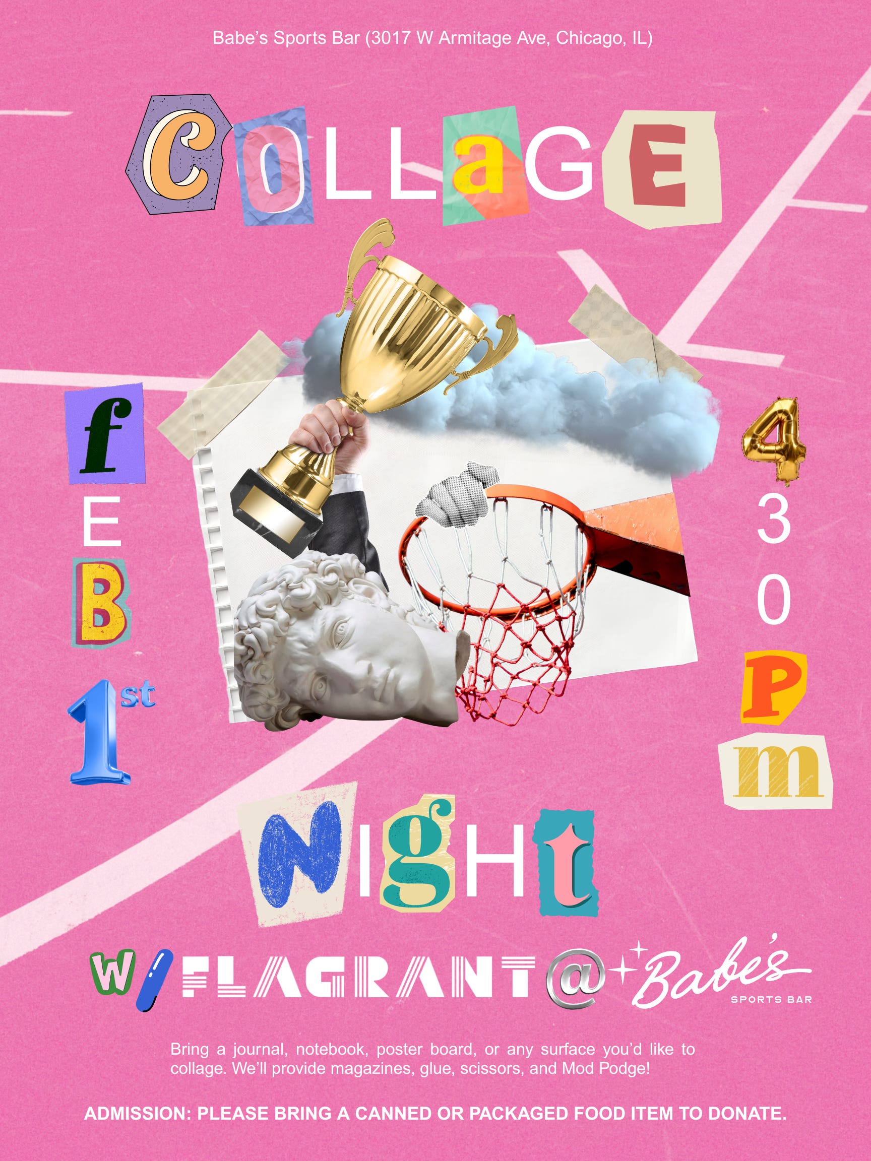 Join Ciara at Babe’s Sports Bar on Sunday, Feb. 1st @ 4:30pm for collage night! We bring the mags/scissors/glue, you bring something to collage and a canned good to donate. See you absolute sweeties and freaks there!